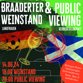 Im Gemeindezentrum wird die Kerbegesellschaft ab 20.00 Uhr das Eröffnungsspiel der Fußball EM Deutschland gegen Schottland auf einer Leinwand zeigen. Bier und andere gekühlte Getränke sind an der Theke erhältlich.