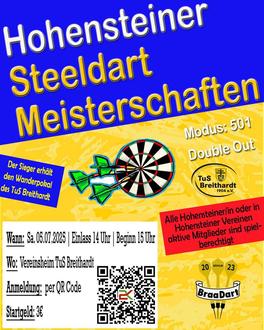es ist uns eine große Freude, euch zur 1. Hohensteiner Steeldart Meisterschaft einzuladen! Am Samstag, 05.07., ab 15.00 Uhr, stellen wir im Vereinsheim des TuS Breithardt eure Geschicklichkeit, Präzision und Nervenstärke in einem hoffentlich spannenden Wettkampf auf die Probe.