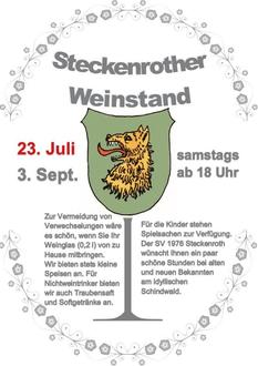 Nach der erfolgreichen Weinstand-Premiere lädt der SV Steckenroth am Samstag, 23. Juli, ab 18.00 Uhr zum gemütlichen Umtrunk auf sein Sportgelände ein. Hoch oben über Steckenroth und am idyllischen Schindwald gelegen, können dann erneut verschiedene Tropfen probiert, kleine Leckereien gegessen, die Aussicht und der Sonnenuntergang genossen und alte und neue Bekannte getroffen werden. Für die Kids ist dann ebenfalls gesorgt. Diverse Spielzeuge und Fußbälle stehen zur Verfügung.