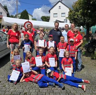Im Rahmen des Borner Dorffestes, das vom 06. – 07.07. gefeiert wurde, konnten 13 Kinder der Borner Kinderfeuerwehr „Grisus“ Ansteck-Plaketten und Urkunden für bestandene Tatze-Prüfungen entgegennehmen. Die Ehrungen nahmen Martin Boecker als stellvertretender Wehrführer sowie Barbara Wieder als Ortsvorsteherin vor. Zuvor demonstrierten die Kinder bei einer Schauübung vor vielen Zuschauern ihr Können. Regnete es am Samstag noch pünktlich zur Eröffnung des Festes, so konnte kurz darauf bei schönem Wetter und voller „Feiermeile“ nach einjähriger Pause wieder das beliebte Dorffest bis in den späten Abend gefeiert werden. Der Sonntagvormittag begann dann mit einem ökumenischen Gottesdienst, bevor die Kinder der Kindertagesstätte „Villa Sonnenschein“ die Zuschauer mit einem Fußballlied erfreuten. Das Fest endete in den frühen Abendstunden nach zwei gelungenen Tagen.