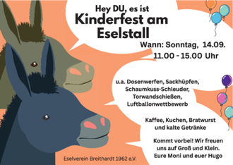 Der Eselverein Breithardt e.V. gratuliert der Breithardter Feuerwehr ganz herzlich zum großartigen ersten Platz beim Bezirksentscheid der Feuerwehrleistungsübung und drückt für die Feuerwehrleistungswettkämpfe auf Landesebene am 31. August in Lorsch fest die Daumen. Auch den Landfrauen des Bezirkes Untertaunus, die am selben Tag in der Breithardter Halle mit Unterstützung der Braaderter Kerbegesellschaft ihr 75-jähriges Bestehen feiern, wünschen wir viel Freude bei ihrer Jubiläumsveranstaltung. Das Kinderfest am Eselstall wird daher um zwei Wochen verschoben und findet am Sonntag, 14. September statt.