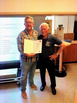 Wolfgang Bingel drückte den Dank des gesamten Vorstands durch Überreichen eines Präsents aus. Man hätte ihm die Kasse des Vereins gern noch weiter überlassen. Erfreulich, dass seine Nachfolge in gute Hände gelegt werden konnte.