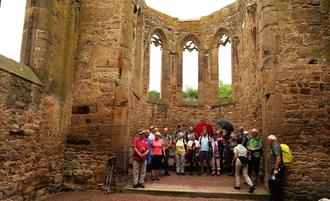 Sanft tröpfelte es nahe der Beller Kirche, einem früheren Wallfahrtsort. Deutlich unterschieden sich die beiden Bauabschnitte des Kirchengebäudes. Zuerst stand nur der Chorraum und später wurde wegen des großen Zuspruchs angebaut. Gunhild erzählte von einst und der jetzigen Nutzung des gotischen Gemäuers. So als wolle sich der Himmel darüber grämen, dass die Gruppe im Chor stehend keinen Choral zum über den Menschen offen sichtbaren Firmament sendet, fing er an zu weinen und Regenschirme bestimmten fortan das Bild. Der „Strandpfad der Sinne“ war das unmittelbar sich anschließende Ziel. Steine aus dem einstigen Urmeer und zahlreiche Pflanzen mit Hinweistafeln regten die Sinne an und bei besserem Wetter hätte man gerne hier ein halbes Stündchen und vor allem weibliche Teilnehmer auch mehr, verbringen können. Von dem Hang des einst als Insel aus dem Urmeer herausragenden Hügels strebte die Wandertruppe dem nächsten „Hiwwel“, der ebenfalls wie ein Inselberg aus der ansonsten recht flachen Gegend herausragt, entgegen. Eine Sitzgruppe, allerdings ohne Überdachung, als „Winzeralm“ in der Karte bezeichnet, sollte für einen speziellen „Web-Auftritt“ erklommen werden. Allein der Himmel erhob mit Blitz und Donner sinnigerweise nach dem Durchschreiten eines als „Hölle“ bezeichneten Wäldchens Einspruch. Die Wanderführer nahmen die Drohungen ernst und verkündeten nach einem Telefonat mit einem befreundeten Winzer Plan B. Mit stoischer Gelassenheit nahmen die Wandersleute die Bemühungen von Petrus auf, sich an Stelle mit Wein mit Wasser zu laben und stapften zurück zu den Fahrzeugen. Hier verkündete Werner: „Mir nach zu einer Scheune auf einem Winzerhof in Gau-Bickelheim“. Der Transfer klappte und in der Halle war eine lange Tafel gedeckt. Im vor allem trockenen etwas rustikalen Ambiente konnte nun das WWW empfangen werden. Weck, Woscht und Woi diverser Rebsorten und Ausbauformen mundeten den Wanderern, so dass alsbald an der gehobenen Stimmung erkennbar wurde, dass es sich mit Plan B wahrlich gut leben ließ. Da der Himmel am Nachmittag seine Bewässerung eingestellt hatte, ergänzten 23 Läuferinnen und Läufer die auf 6,2 km verkürzte Wanderung mit einem 5,7 km langen Fußmarsch nach Wöllstein zur geplanten Schlussrast. Die Speisen mundeten und als Durstlöscher floss überwiegend alkoholfreies Bier durch die Kehlen der Wandersleute. Die Stimmung war sehr gut und so wollen wir am Schluss Gunhild, Werner und dem Himmel danken, denn nicht zuletzt durch seine Einlagen und die gekonnten Reaktionen wurde Siefersheim zu einer unvergesslichen Tour.