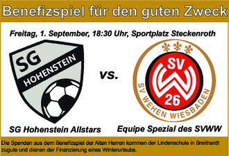 Spaß haben und Gutes Tun: die Allstars der SG Hohenstein spielen am Freitag, 01.09 um 18.30 Uhr auf dem Sportplatz in Steckenroth gegen die Equipe Spezial des SV Wehen Wiesbaden. Im Rahmen der Partie der SGH gegen die Traditionself des Zweitligisten werden Spenden gesammelt, die der Lindenschule in Breithardt zugutekommen werden. Die Schule möchte einen Winterurlaub veranstalten und freuen sich über finanzielle Hilfe. Die Allstars der neuen Spielgemeinschaft freuen sich über einen schönen Fußballabend mit vielen Hohensteinern, die dem Benefizspiel in Steckenroth beiwohnen.