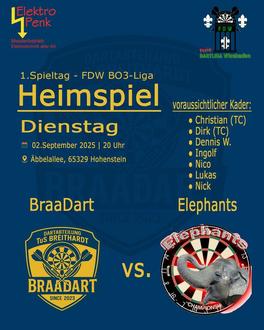 In der Freien Dartliga Wiesbaden treffen wir auf die Elephants aus Wiesbaden - und das direkt vor heimischer Kulisse im Vereinsheim des TuS Breithardt.