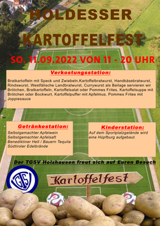 Am Sonntag, 11.09. dreht sich auf dem Sportplatz des TGSV Holzhausen wieder alles um die Knolle. Auf der Speisekarte stehen Kartoffelpuffer, Kartoffelsuppe, Kartoffelwürste und vieles mehr. Für die Kinder gibt es eine Hüpfburg.