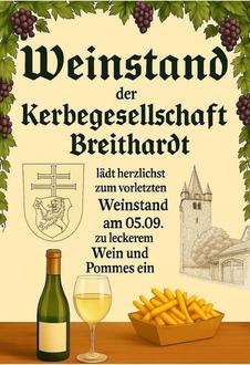 Am Freitag, 05. September lädt die Kerbegesellschaft Breithardt ab 18:00 Uhr zum Weinstand nach Breithardt ein. Für leckeren Wein und eine Kleinigkeit zu Essen ist natürlich gesorgt.