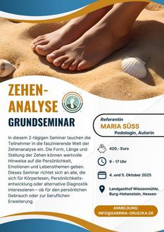 Eine der bekanntesten Expertinnen auf diesem Gebiet ist die Podologin und Autorin Maria Süß. Mit ihrem fundierten Fachwissen verbindet sie medizinische Kompetenz mit der feinen Kunst des Zehenlesens. Ihre Seminare sind praxisnah, inspirierend und eröffnen einen tiefen Einblick in die Zusammenhänge zwischen Körper und Seele.