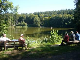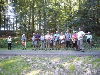 Zuerst musste einmal tüchtig gelaufen werden, denn die Wanderung sollte ja über 9 km lang sein. Um das Gärtnereigelände führte der Wanderführer die Gruppe zum Hühnerberg. Als es auf einem Trampelpfad zum Radweg in Richtung Wallrabenstein hinaufging, atmeten einige hörbar auf, „Ah, endlich Schatten!“ Der noch intakte Laubwald spendete auch weiterhin Schatten und zuweilen wehte sogar ein erfrischendes Lüftchen. Als dieser Waldabschnitt durchlaufen war, reizte die Aussicht zu den Taunusbergen Großer und Kleiner Feldberg. Der nun nach links abbiegende Weg in Richtung Bechtheim wurde ebenfalls zumeist von allzu starker Sonneneinstrahlung verschont. So passierten die Wanderer munter ausschreitend das Verkehrsübungsgelände und danach ging es bergab. Dort, wo der Radweg nach Bechtheim links abbiegt, blieb die Gruppe auf der in gerader Richtung weiter führenden Forststraße. Eine kurvige Steilstrecke, auch wenn sie abwärts ging, galt es zu meistern, denn die Bremsen einiger „Oldtimer“ neigen dazu, an solchen Abschnitten leichte Verschleißerscheinungen zu offenbaren. Bei einer Jagdhütte sammelte sich die Gruppe, um gemeinsam den Beuerbacher Waldsee zu erreichen.