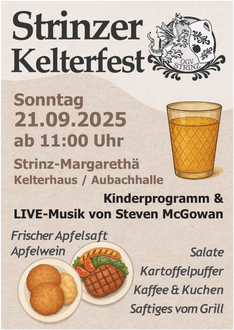 Diesem Jahr findet das traditionelle Kelterfest in und um Aubachhalle und Kelterhaus in Strinz-Margarethä am Sonntag, 21. September statt. Aufgrund der früheren Reife des heimischen Obstes wurde der Termin um eine Woche vorgezogen.