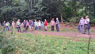 21 Wanderwillige mit der Ambition einer etwas längeren Tour wagten sich mit Horst zuerst an den steilen Anstieg, während die restlichen acht Läufer mit Hildegard die zunächst für beide Gruppen identische Strecke etwas ruhiger angingen. Hinweistafeln zur historischen Straße, einem Köhlerplatz sowie zur Hennethaler Landwehr sorgten nicht nur für Informationen, sondern auch für ausreichende Verschnaufpausen, denn nur mit reiner Muskelkraft war der Weg zu schaffen. Nach den nur noch schwach erkennbaren Resten des Wallsystems mit Gebück lockte als Ziel heute die Wüstung Rahnstätter Hof. Auf dem Weg dorthin passierten die Wanderer einen alten Grenzstein und eine Tafel, welche auf die Ackerraine des ehemaligen Hofgeländes aufmerksam machte. Von der einstigen Hofreite ist kein einziger Stein geblieben, lediglich ein nachträglich errichtetes Dach über einem Loch zeigt die Stelle des Brunnens für den Hof. Auf die den angrenzenden Laubwald überragenden mächtigen Tannen und Lärchen fiel möglicherweise nicht nur der wohlgefällige Blick des Wanderführers. Ein Strauch Zwergholunder mit Blüten und Früchten in unterschiedlichen Reifestadien sorgte noch für aufmerksame Betrachtung bei Interessierten.