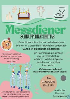 Du wolltest schon immer mal wissen, was „Dienen“ im Gottesdienst eigentlich bedeutet? Dann lädt die katholische Pfarrei Heilige Familie Untertaunus herzlich ein. Am 21. September von 15:00 bis 18:00 Uhr können alle Kinder und Jugendlichen unverbindlich erfahren, welche Aufgaben als Messdiener:in anfallen und wie alles funktioniert. Es werden Waffeln gebacken und ein toller und entspannter Nachmittag verbracht. Das Ganze findet am Kirchort Herz Jesu Schlangenbad Rheingauer Str. 19 statt. Um Anmeldung wird gebeten über das zentrale Pfarrbüro 06124/72370 oder per Mail über k.kaulich@heiligefamilie.net.
