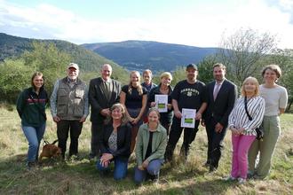 Die Preisträger, Sponsoren und Jurymitglieder an der Siegerfläche. Von links: Theresia Feldmann (HessenForst), Dr. Wolfgang Ehmke (Bürgerstiftung Unser Land!), Volker Diefenbach (Vorsitzender LPV), Annika Lustermann (3. Platz), Rolf Hussing (Bürgerstiftung Unser Land!), Alexandra Lustermann (3. Platz), Walter Kempenich (1. Platz), Landrat Sandro Zehner, Martina Schuhmacher (Naturpark RheinTaunus), Maja Becker (LPV). Vorne: Sonja Kraft (LPV), Miriam Tenhaken (LPV). (Bildautor LPV)