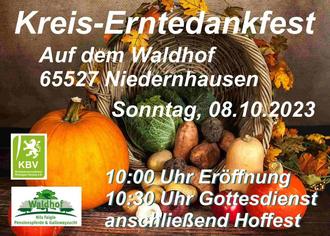 Der Kreisbauernverband Rheingau-Taunus e.V. freut sich, in diesem Jahr wieder sein traditionelles Erntedankfest feiern zu können. Es findet am Sonntag, dem 08. Oktober im Rahmen des Hoffestes auf dem Waldhof in Niederseelbach statt. Das Erntedankfest beginnt um 10.00 Uhr mit der Eröffnung durch den KBV, gefolgt vom Erntedank-Gottesdienst. Anschließend wird zum großen Hoffest mit Landtechnikausstellung, Bull-Riding, einem Programm der Waldhof-Reitschule und vielen regionalen Angeboten eingeladen. Für heimische kulinarische Leckereien ist natürlich umfangreich gesorgt.