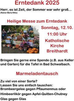Am Sonntag, 12. Oktober feiert die kath. Pfarrei Heilige Familie Untertaunus am Kirchort St. Klemens-Maria-Hofbauer um 11:00 Uhr die Heilige Messe zum Erntedank. Spenden (z.B. aus Keller und Garten) werden gerne entgegengenommen für die Tafel in Bad Schwalbach.