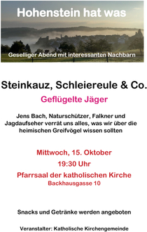 Am Mittwoch, 15. Oktober lädt die kath. Pfarrei Heilige Familie Untertaunus am Kirchort St. Klemens-Maria-Hofbauer um 19:30 Uhr in den Pfarrsaal der katholischen Kirche (Backhausgasse 10) ein. Jens Bach, Falkner, Jagdaufseher und Naturschützer erzählt alles, was man über Greifvögel unserer Heimat wissen sollte und wissen möchte. Der Eintritt ist frei, Getränke und Snacks werden angeboten.