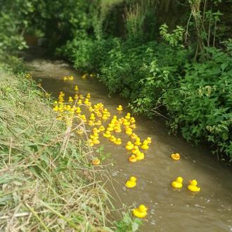 Mit Spannung erwartetes Highlight war dann das Entenrennen auf dem Aubach, der dieses Jahr ausreichend Wasser führte. Über 100 Rennenten schwammen gleichzeitig um die Wette.