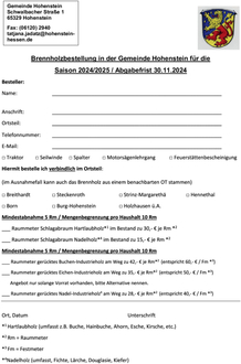 Ihre Brennholzbestellung können Sie ab sofort bis 30. November 2024 bei der Gemeinde Hohenstein, Schwalbacher Str. 1 einreichen, oder uns per Fax 06120/2940 oder E-Mail an: tatjana.jadatz@hohenstein-hessen.de zukommen lassen.