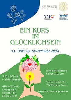Schon Abraham Lincoln war der Meinung: "Die meisten Menschen sind so glücklich, wie sie es sich selbst vorgenommen haben." Wie viel Glücklichsein nimmst Du Dir vor? Gehe während des 2-teiligen Kurses am 21. und 28.11. jeweils von 19.30 - 21.30 Uhr mit der Mentaltrainerin Sabrina Gruszka auf die Reise und erforsche, welche Möglichkeiten Du hast, damit Du Dich auch in herausfordernden Lebenssituationen gestärkt, wohl und glücklich fühlst. Die Anmeldung erfolgt über die vhs unter der Tel. 06128 / 927739 oder info@vhs-rtk.de