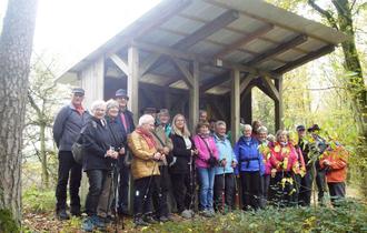 Für Donnerstag, 24.10. hatte der Wanderführer den Eulenberg als Wandergebiet für eine Tour des Hohensteiner Wanderkreises ausersehen. Dies bot Gelegenheit, auf dem im Herbst besonders attraktiven Abschnitt des Aar-Höhenweges zu laufen und zugleich den 25 Wanderern - oder waren es doch 27, wie jemand gezählt hatte – Teile der neu konzipierten Aar-Schleife zu zeigen. Dieser neue Wanderweg beginnt zusammen mit der Borner Runde am Waldrand des Distriktes „Auf dem Noll“, also stapften die Wandersleute pünktlich um 14.00 Uhr parallel zum Trimm-Pfad zur Grenze von Adolfseck. Während die Aar-Schleife wenig später bereits den Grenzweg in Richtung Pohlbach verlassen soll, blieb die Gruppe weiter auf der Borner Runde und somit auf dem Grenzweg. Auch wenn sich besonders manche Wanderin den Sonnenschein des Vortages gewünscht haben mag, so bot der heutige Hochnebel besonders stimmungsvolle, zur Jahreszeit passende Aussichten. Der weichgezeichnete Ausblick auf Lindschied entsprach so fast einem Gemälde eines Romantikers. Selbstverständlich musste der Wanderführer auf die Bedeutung des Zollstockes und den „Keltischen Friedwald“ im Strütchen hinweisen, bevor es auf der Forststraße in Richtung Umsetzer weiterging. Für den talaufwärts von dieser Forststraße im spitzen Winkel abzweigenden Aar-Höhenweg mussten einige Spitzenläufer abgebremst werden, denn der Wanderweg verlässt etwas unscheinbar die breite Trasse. Nicht nur für Puristen in Sachen Wandern begann nun der ideale Wandersteig. Unebenheiten und Bewuchs des Waldweges wechselten mit Passagen eines üppigen Laubteppichs ab. In einer Kurve zogen dicke saftige Moospolster über neongrün schimmernden Flechten auf den anstehenden Schieferplatten die Blicke auf sich. Ein Kahlschlag bot erste Ausblicke auf Bad Schwalbach. Es folgte ein kurzes Stück des einstigen Postweges und dann musste die Gruppe bei der Bank mit dem „Fünfkirchen-Blick“ eine Pause einlegen, denn nun galt es die Gotteshäuser zu entdecken. Im weiteren Verlauf des Weges bis zur Schutzhütte erlaubte der herbstliche Wald immer wieder Durchblicke ins Aartal. Die besonders hübsche Aussicht auf Hettenhain von einer vorspringenden Felsnase wurde von etlichen Wandersleuten genutzt. Weil die Schutzhütte die Gruppe weder vor Wind noch Regen schützen sollte, diente sie lediglich als Ort, um sich für ein Gruppenfoto zu positionieren.