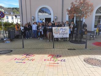 Eine Möglichkeit für junge Menschen, sich aktiv für Demokratie, Vielfalt und Toleranz einzubringen, stellt im Rheingau-Taunus-Kreis das seit 2019 etablierte Jugendforum (YoUFO) der hiesigen Partnerschaft für Demokratie dar. Dessen Mitglieder Maya Reichert und Simon Jäger stellten das Jugendforum, sowie dessen Projekte und Fördermöglichkeiten vor. Zur Mitarbeit im Jugendforum sind alle jungen Menschen im Alter von 14 bis 27 Jahren aus dem Kreisgebiet eingeladen. Mit einem eignen Budget können die dort engagierten Jugendlichen eigene Projekte umsetzen oder Projekte von und für Jugendliche finanziell unterstützen. So hatte das YoUFO in der Vergangenheit beispielsweise ein politisches PubQuiz veranstaltet und eine lebendige Bibliothek organisiert. Maya Reichert und Simon Jäger luden alle anwesenden Teilnehmenden der Demokratie-Konferenz ein, gemeinsam mit Sprühkreide ein farbenfrohes Statement für Vielfalt vor dem Alleesaal in Bad Schwalbach zu gestalten. Diesem Aufruf wurde mit viel Engagement nachgekommen, sodass der Slogan „Platz für Vielfalt“ insgesamt dreimal in unterschiedlichsten Farbkombinationen gestaltet werden konnte.
