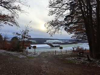 In der Nacht zu Donnerstag, 21.11. hatte es den ersten Schnee für diesen Winter gegeben. Als hätte man im Himmel unachtsam mit Staubzucker hantiert, so präsentierte sich das Land mit einer dünnen weißen Schicht. Temperaturen um 0°C, aber ohne Wind, sorgten für gute Bedingungen für eine zünftige Wanderung, so sahen es wohl auch die zwei Dutzend Wanderwilligen am Treffpunkt des Hohensteiner Wanderkreises in Holzhausen über Aar. Dass kein Mitläufer frösteln musste, dafür sorgte rasch die Abwärme der Muskelmotoren beim Anstieg zur Eisenstraße. Aber Halt! Die Gruppe hatte zwar ein flottes Wandertempo vorgelegt, aber so hurtig erreichten die Wanderer den historischen Weg zum Eisentransport nicht. Einen ersten Stopp gab es beim Girschbach. Die frischen Blätter dieses Krautes werden von Naturköstlern sehr geschätzt und die Wurzeln von Gärtnern gefürchtet. Wo die für Autos freigegebene Trasse nach rechts abbiegt, sorgte der Abstieg zum Graben des Schefterbaches für eine kurze Verschnaufpause. Vor dem Eintritt in den Wald glitten viele Augenpaare über die verschneite Landschaft, denn diese Sicht auf die Feldflur hatte man länger nicht gehabt und man musste sie genießen. Das in unterschiedlichen Brauntönen gefärbte Laub der Buchen im Unterholz, sozusagen das Kleid der Teenager des Forstes, sorgte für warme Farbtupfer. Der Eisenstraße in Richtung Michelbach folgend, wies der Wanderführer bei dem entsprechenden Abzweig auf einen längst aufgelassenen Hof und eine Landwehr hin. Kurz vor dem Segelfluggelände zeigte ein schöner alter Grenzstein an, dass nun die heimische Gemarkung verlassen wurde. Der Flugbetrieb auf dem Michelbacher „Airport“ ruhte und so konnte die Wandergruppe gefahrlos den die Flugschneise querenden Weg beschreiten. Selbstverständlich wurde hier die Aussicht gewürdigt und der Blick auf Kettenbach sogar im Foto festgehalten.