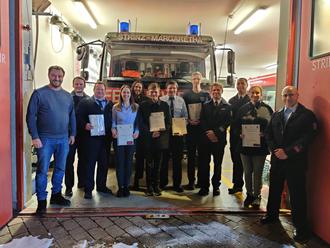 Bürgermeister, GBIs und Wehrführer mit beförderten Mitgliedern v.l.n.r.: Daniel Bauer (Bürgermeister), Sven Bach (Stellv. GBI), Marcel Buck (Stellv. Wehrführer), Jana Schnurr, Linda Drury, Marek Glaser, Sebastian von der Heydt, Leon Reinhard, Florian Pasucha (Stellv. GBI), Simon Fuhr (GBI), Selina Eichler, Kevin-Gene Weiß (Wehrführer).