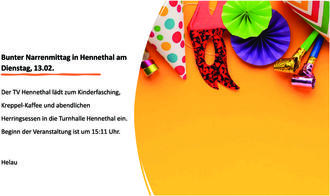 Der TV Hennethal lädt zum Kinderfasching, Kreppel-Kaffee und abendlichen Heringsessen in die Turnhalle Hennethal ein.