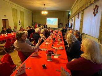 Während Hildegard auf dieser Verbindungsstraße nach Strinz-Margarethä zur Eisenstraße weiterlief, bog Horst auf dem nach links in Richtung Windräder hinauf steigenden Weg ab. Etappenziel für beide Gruppierungen war der Standort einer Hinweistafel zur „Villa Rustica“. 26 Wandersleute nutzten den mit dieser Bezeichnung markierten Weg bis zum Gewann „Auf der Wieslatt“. Noch einmal wurde die Aussicht auf unsere schöne Heimat genossen, um sich sodann hurtig auf den Weg zum adventlich geschmückten Saal zu begeben, wo bereits nicht nur die Kurzstreckler eingetroffen waren.