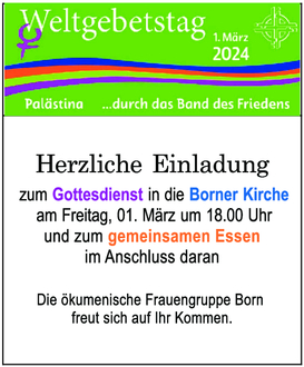 | 18.00 Uhr | Weltgebetstag mit den Ökumene Frauen aus Born |