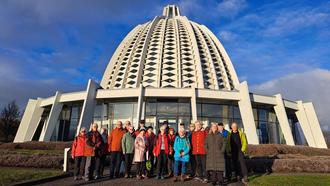 Hans Jürgen führte seine Gruppe auf einem 6,6 km langen Weg rund um den 410m hohen Judenkopf. Hurtig permanent abwärts schreitend strebte unser heutiger Führer zu einem Etappenziel mit besonderer Aussicht. Über den Baumwipfeln tauchten aus dem Dunst Hochhäuser auf, die Skyline der Mainmetropole. Eine Hütte animierte zur Aufstellung eines Gruppenfotos, denn schutzbedürftig waren wir heute nicht. Ein weiterer Punkt rückte die Hänge der höheren Taunusberge in das Blickfeld. Diese Aussichten musste Mann oder Frau gesehen haben. Nach den vielen Abwärtsbewegungen schwante es auch dem letzten, dass die verlorene Höhe nun wieder erstiegen werden musste. Von einer Wegekreuzung aus wurde sozusagen in einem Rutsch der Kammweg wieder erklommen. Auf der Höhe wurde die Gruppe von der Sonne begrüßt. Im Licht der Sonnenstrahlen und mit der Zufriedenheit über die vollbrachte Steigleistung wirkte dieser Forstabschnitt besonders erhebend. Über ein paar „Bodenwellen“ erreichten die Wanderer wieder den Startplatz und liefen gleich weiter zu dem Zentrum der Bahai. Die Wandergruppe wurde freundlich aufgenommen und selbstverständlich über die Religionsgemeinschaft informiert. Ein Gang um und in das architektonisch bemerkenswerte Haus der Andacht vervollständigte einen ersten Eindruck. Dieser außergewöhnliche Höhepunkt wird wohl allen Teilnehmern in schöner Erinnerung bleiben.