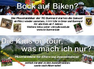 Die Mountainbiker der TG Boppard starten ab März wieder ihr Außentraining für alle Gruppen! Ob Groß, ob Klein, alle sind eingeladen, wieder gemeinsam die heimischen Strecken unter die Stollen zu nehmen! Neben dem Kinder- und Jugendtraining für begeisterte Fahrer ab 7 Jahren, bietet die TG auch eine Funsport-/Breitensportgruppe im Erwachsenenbereich an, vorwiegend parallel zu den Kids, jedoch auch an gesonderten Terminen nach Absprache.