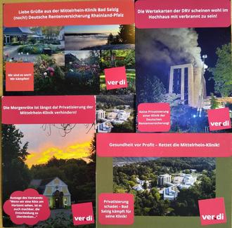 Die Beschäftigten der Mittelrhein-Klinik kämpfen für den Erhalt und gegen eine Privatisierung der Klinik. Gegenüber der Personalvertretung habe ich erneut deutlich gemacht, dass Bad Salzig hinter den Beschäftigten steht und mit ihnen gemeinsam kämpfen wird. Das Material, was mir dafür zur Verfügung gestellt wurde, habe ich dann direkt mit zum Nachbarabend der 3. Nachbarschaft genommen. Ein großes Transparent war innerhalb kürzester Zeit mit Unterschriften gefüllt und hängt jetzt am Theodor-Hoffmann-Haus. Dutzende Postkarten fordern den Vorstand der DRV RLP auf, den geplanten Verkauf zu stoppen. Weitere Postkarten liegen im Eingangsbereich des Theodor-Hoffmann-Hauses aus und können entweder per Post verschickt oder in der Mittelrhein-Klinik abgegeben werden. Machen Sie mit und lassen Sie uns gemeinsam für den Erhalt unserer Klinik kämpfen!