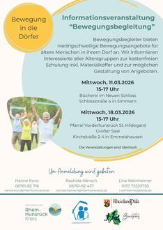Die Gemeindeschwester plus, die Gesundheitsmanagerin und die Bewegungsmanagerin des Rhein-Hunsrück-Kreises wollen “Bewegung in die Dörfer” bringen. Gesucht werden Menschen, die Freude an Bewegung haben und diese weitergeben möchten, um ein lokales Angebot zu schaffen. Hierzu soll es im Herbst eine kostenlose Weiterbildung zum Bewegungsbegleiter geben. Diese befähigt dazu, niedrigschwellige Bewegungsangebote - vorrangig für ältere Menschen - im Ort zu etablieren. Die Teilnehmenden erhalten außerdem einen Materialkoffer. Infoveranstaltungen für Interessierte finden am Mittwoch, 11.03. von 15-17 Uhr in Simmern und am Mittwoch, 18.03. von 15-17 Uhr in Emmelshausen statt. Anmeldung bei Lina Weinheimer, 0157 72529730, l.weinheimer@lsbrlp.de.