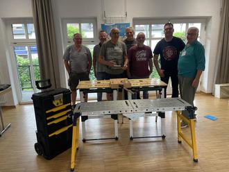 Einige Mitstreiter des Reparaturcafés Bad Salzig vor den mobilen Werkzeugen.