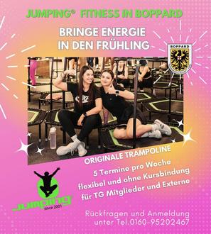 Seit 2024 springen wir auf originalen Jumping Fitness Trampolinen in Studioqualität (zugelassen bis 130 kg). Standort: Gymnastikhalle der Grundschule, auf der Zeil 20, Boppard.
