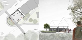Die Sanierung der Leonorenquelle hat begonnen: So, wie auf dem Grundriss und der perspektivischen Darstellung aufgezeigt, sollen die neue Trinkhalle und das Umfeld an der Ecke Römerstraße/Salzbornstraße nach der Fertigstellung aussehen.