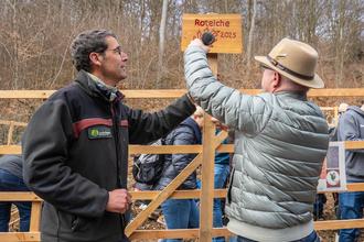 Bürgermeister Jörg Haseneier (rechts) und Revierförster Johannes Nass beim Anbringen des Informationsschildes am Gatter des Kinder- und Hochzeitswaldes
