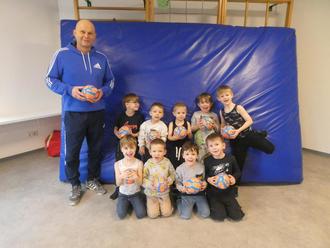 Frank Gutmann und die Kinder der Fußball-Gruppe der Bewegungskita Weiler mit den neuen Mini-Fußbällen, die der SC Weiler gesponsert hat.