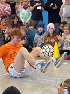 Er zeigte den Schülern beeindruckende Tricks mit dem Ball. Einige Kinder durften ihn sogar bei seinen Kunststücken unterstützen. Nebenbei ermutigte er die Kinder auch immer wieder, dass man im Leben #immerweiter (sein Motto) machen muss, auch wenn einem auf Anhieb etwas nicht gelingt. Ebenso wurden die Kinder von ihm darauf sensibilisiert immer zusammenzuhalten und auf ein gutes Miteinander zu achten.