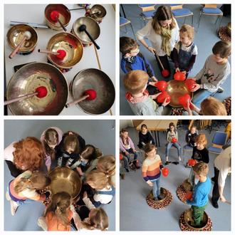 Was bringt eine Klangschale zum Klingen? Warum klingen auch unsere Körper? Welche Bälle klingen wie? Mit Luftballons in der Hand konnte dann jeder die Klänge sehen und die Vibrationen spüren. Ein besonderes Erlebnis war das Stehen und Fühlen in den großen Klangschalen, die mit großen Schlägeln angeschlagen wurden. Die begeisterten Kinder und Klassenlehrerinnen der Klassenstufe 2 sagen Danke für diese tolle Erfahrung.