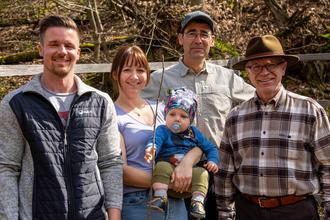 Stadt Boppard - Familie Uhrmacher pflanzte im Bopparder Kinderwald ein Bäumchen für Sohn Leonard. Auf dem Foto (von links): Ludwig und Sarah Uhrmacher mit Leonard, Revierförster Johannes Nass und Boppards Bürgermeister Jörg Haseneier.
