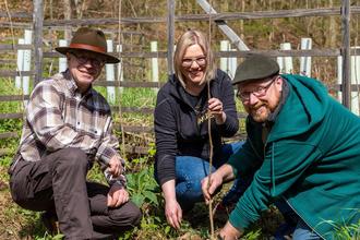 Stadt Boppard - Auch im Hochzeitswald wurden einige Ebereschen gepflanzt. Auf dem Foto (von links): Bürgermeister Jörg Haseneier sowie Ivonne und Walter Perll, die sich im vergangenen Jahr in Boppard das Ja-Wort gegeben haben.