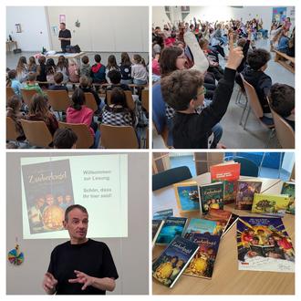 Auch in der Lesung für Klassenstufe 3 und 4 erfüllten strahlende Kinderaugen und Kinderlachen den Raum mit ein bisschen Zauber und purer Begeisterung. Der Autor stellte den Kindern sein Buch „Im Zeichen der Zauberkugel“ vor. Fesselnd, mit darstellender Gestik und Mimik, unterstützt mit toll ausgewählten Bildern und einer wortgewaltigen Stimme versanken alle in der Zaubergeschichte. Zwei Kinder durften dann noch mit Stefan Gemmel gemeinsam die Geschichte weitererzählen und die schwarze Katze Kadabra sprechen. Am Ende der Lesung forderte eine Schülerin noch eine Zugabe ein und diese erfüllte Stefan sofort mit einem kleinen Witz für die Kinder.