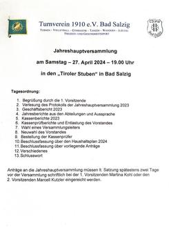 Am Samstag den 27. April 2024 um 19.00 Uhr findet die Jahreshauptversammlung des TV Bad Salzig in den Tiroler Stuben in Bad Salzig statt.