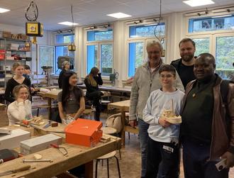 Im Rahmen seines Besuches in Boppard besucht Father Placide (rechts) aus Muyange in Ruanda auch die Bischöfliche Realschule Marienberg. Seit vielen Jahren unterhält der Freundeskreis Nyabitekeri-Ruanda-Boppard e. V. Kontakte in das rheinland-pfälzische Partnerland. Als Gast in Boppards Bistumsschule konnte sich Father Placide unter der Führung von Konrektor Torsten Schambortski ((4.v. r.) einen Eindruck von der Schule verschaffen und im Werkraum Werkstücke wie das Holzschiff von Bogdan Serdiuk (vorne, 2.v. r.) anschauen.