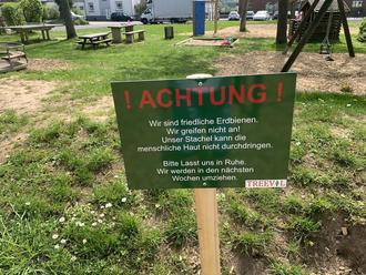 Für die Besucherinnen und Besucher des Spielplatzes besteht daher keine Gefahr, da die Erdbienen von sich aus nicht angreifen. Die Männchen haben auch keinen Stachel, die Weibchen nur einen kleinen, der so dünn ist, dass er die menschliche Haut nicht durchdringen kann. Erdbienen sind friedlicher als Honigbienen und wichtig für unser Ökosystem. Die Fachfirma stellte für die Spielplatzbesucherinnen und Spielplatzbesucher ein Hinweisschild auf.