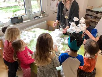 Da Kirsten Herold Bildhauerin ist, bot sie den Kindern Materialien zum gegenständlichen Gestalten an. Von Hefeteig über Kleister, Ton, Gips und Styropor bis hin zu Papier und Jute probierten die Kinder die verschiedenen Möglichkeiten der dreidimensionalen Gestaltung aus.