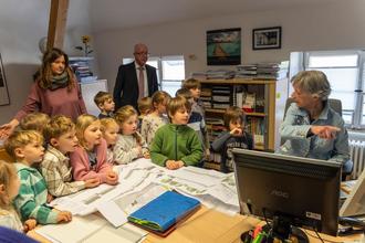 In der Bauverwaltung bestaunten die Kinder die Architektenpläne ihrer Kindertagesstätte, Sachgebietsleiterin Angela Wolf (rechts) erklärte ihnen, welche Arbeiten in einer Bauverwaltung anfallen und dass Architektenpläne früher per Hand und heute am Computer gezeichnet werden.
