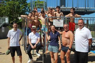 Bürgermeister Jörg Haseneier (sitzend Treppe) eröffnete mit begeisterten Badbesuchern die Schwimmbadsaison